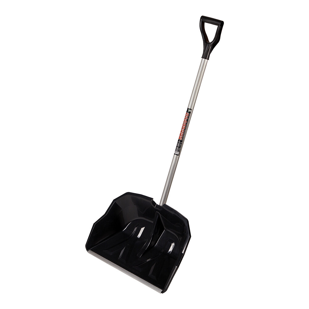 Лопата обладает высокой степенью прочности. Кромка лопаты защищена алюминиевым профилем с небольшим закруглением по краю. Это позволяет легче убирать снег в местах, где территория имеет неровности. Поверхность лопатного ковша гладкая, что значительно снижает вероятность налипания снега. Поставляется с алюминиевым черенком и пластиковой V-образной ручкой.