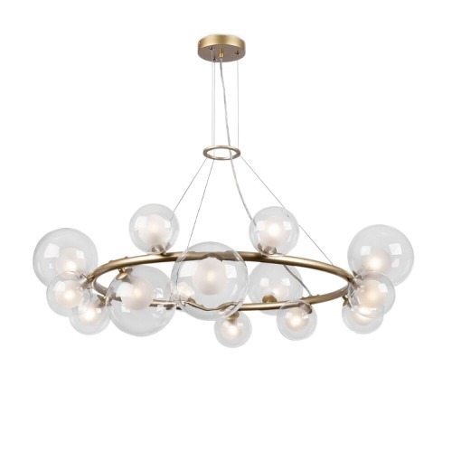 Предназначена для декоративного, интерьерного и общего освещения различных помещений. Арматура оттенка матового золота выполнена из металла, а двойные плафоны-сферы – из стекла. Внутренняя часть плафона – белого цвета, внешняя – прозрачная. Расположенные вдоль широкой окружности, они обеспечивают равномерное, яркое освещение. Визуальную легкость композиции подчеркивают тонкие, почти невидимые тросы – создается иллюзия трендового «парящего» света. Две подвесные люстры обеспечивают различную интенсивность подсветки – можно выбрать подходящий вариант (из 10 или 14 плафонов) с учетом размеров помещения. Светильники станут эффектным акцентным элементом обстановки в стиле mid-century modern, постмодерн, ар-деко, эклектика, хай-тек. Лампы в комплект не входят.