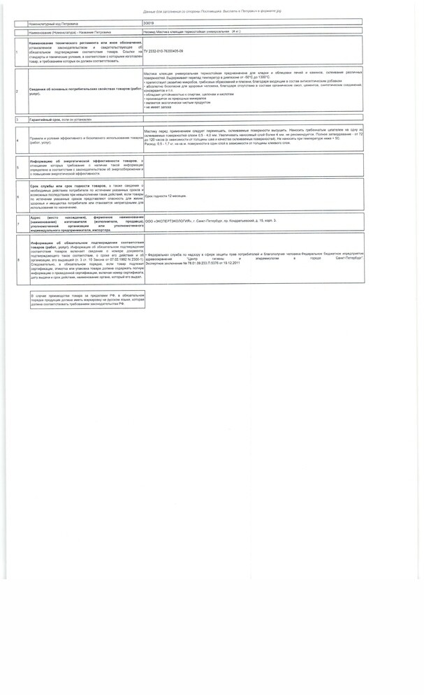 Мастика клеящая универсальная термовлагостойкая (высохший клеевой шов выдерживает температуру от -50 °C до +1300 °C). Предназначена для кладки и облицовки печей и каминов, склеивания кафельной и метлахской плитки, стекла, пенополистирольных потолочных плиток, дерева, картона, бетона, кирпича, натурального и искусственного камня (кроме материалов на гипсовой основе) в любых сочетаниях, неглубокой шпатлевки оштукатуренных и бетонных поверхностей, наклеивания фанеры на стяжку (кроме поверхностей, имеющих постоянный контакт с водой). При склеивании материалов, имеющих периодический контакт с водой, для швов использовать влагоустойчивые герметики или затирки. Содержит антисептические добавки. Препятствует образованию плесени и грибов.