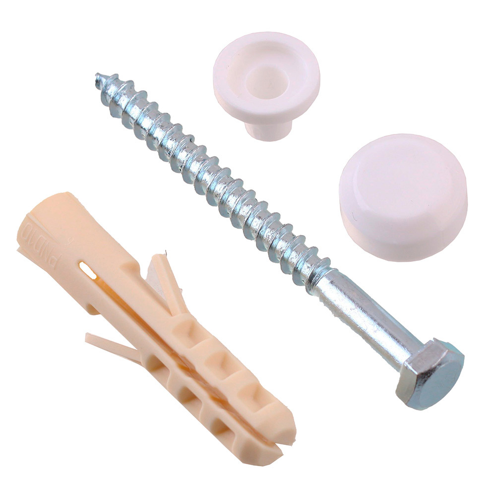 Состав: Шуруп сантехнический 6х70 — 2 шт; Дюбель нейлоновый распорный 10х50 — 2 шт; Заглушка пластиковая — 2 шт; Декоративный пластиковый колпачок — 2 шт.