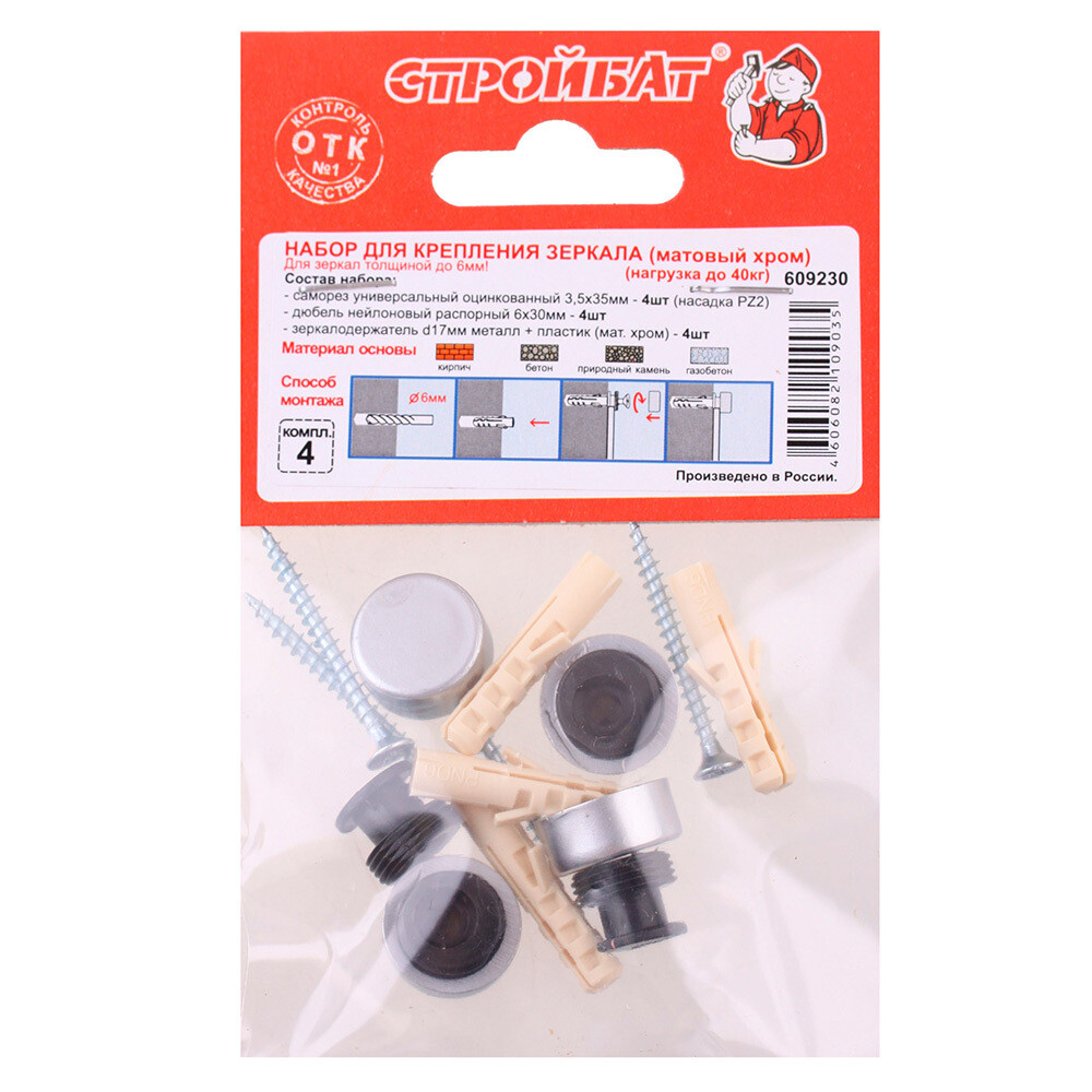 Саморез универсальный 3,5х35 – 4 шт; Дюбель нейлоновый распорный 6х30 – 4 шт; Зеркалодерж. d17мм мет.+пласт. № 3 мат.хром – 4 шт.