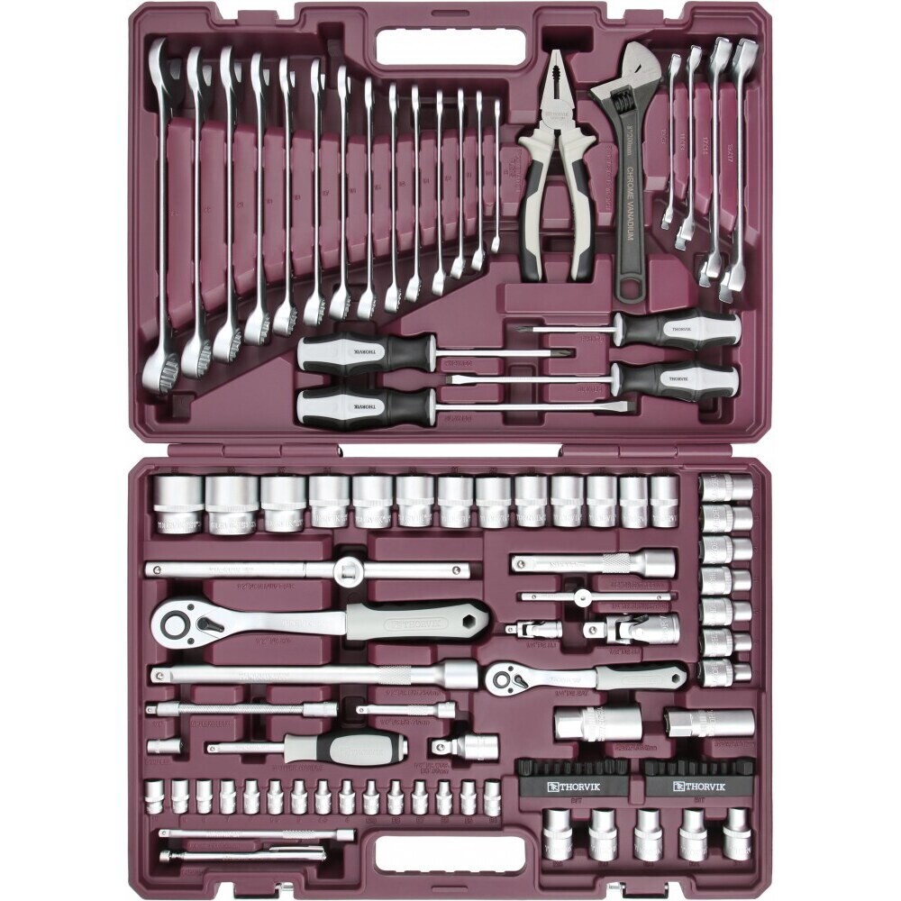 Инструментальный набор Thorvik — это высокое качество изделий, входящих в состав набора, удобный прочный кейс для хранения, оптимальная комплектация позволяющая удовлетворить потребность мастера при обслуживании техники и обеспечить всем необходимым рабочее место при производстве комплексных слесарно-монтажных или механосборочных работ. Имеет ударопрочный морозоустойчивый кейс с надежными металлическими замками, фосфатированное покрытие вставок бит обеспечит дополнительную стойкость к коррозии.
