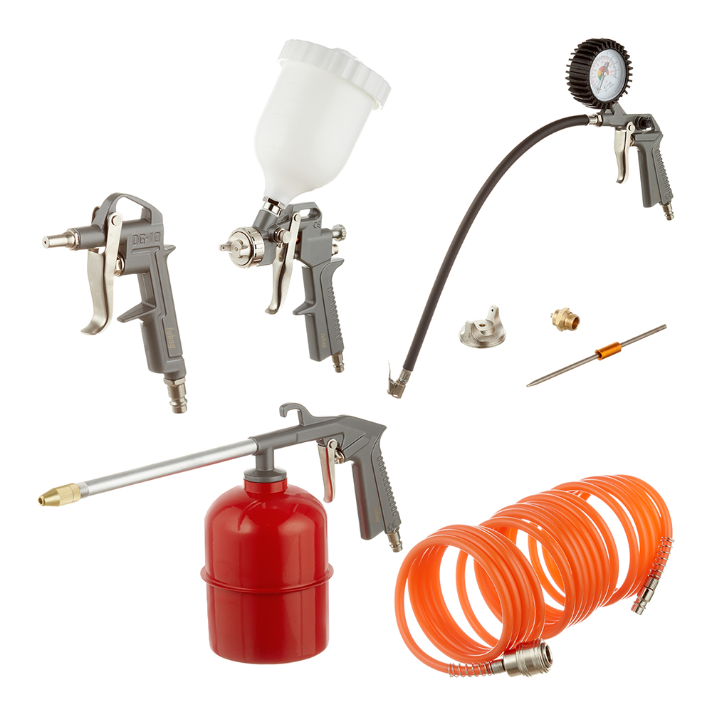 Комплектация: Краскораспылитель с верхним бачком объемом 0,6 л — 1шт.; Пневмопистолет для вязких жидкостей с бачком 0,85 л — 1 шт.; Пневмопистолет для продувки — 1 шт.; Пневмопистолет для накачки шин с манометром — 1 шт.; Спиральный шланг 5 м — 1 шт.