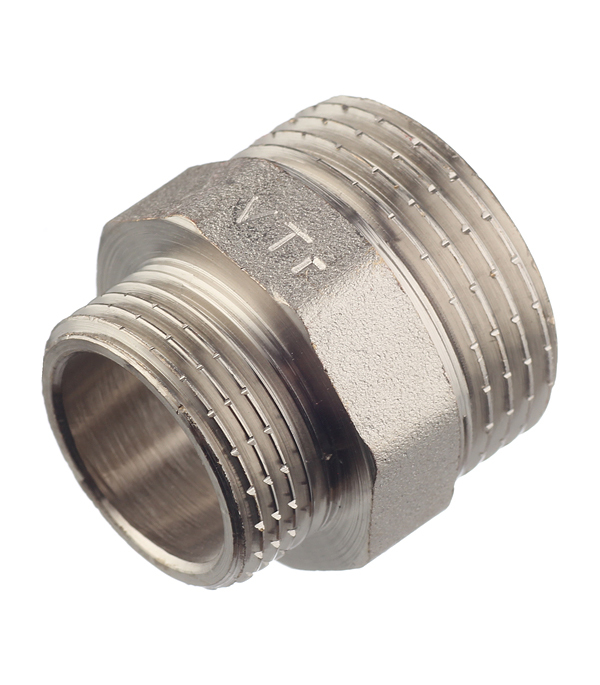 Предназначен для соединения элементов трубопровода разного диаметра. Выполнен из латуни CW617N (евростандарт EN12165) горячим штампованием с последующим никелированием. Резьба обоих патрубков – наружная (тип – цилиндрическая трубная, ГОСТ 6357, ISO 228, EN10226). Насечки на резьбе способствуют удержанию герметизирующего материала (например, сантехнического льна). Наличие шестигранного (под гаечный ключ) участка корпуса облегчает монтаж соединения.Имеет один выход с наружной резьбой 3/4″ (20 мм) и другой с наружной резьбой 1″ (25 мм).