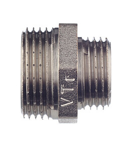 Предназначен для соединения элементов трубопровода разного диаметра. Выполнен из латуни CW617N (евростандарт EN12165) горячим штампованием с последующим никелированием. Резьба обоих патрубков – наружная (тип – цилиндрическая трубная, ГОСТ 6357, ISO 228, EN10226). Насечки на резьбе способствуют удержанию герметизирующего материала (например, сантехнического льна). Наличие шестигранного (под гаечный ключ) участка корпуса облегчает монтаж соединения. Имеет один выход с наружной резьбой 1/2″ (16 мм) и другой с наружной резьбой 3/4″ (20 мм).