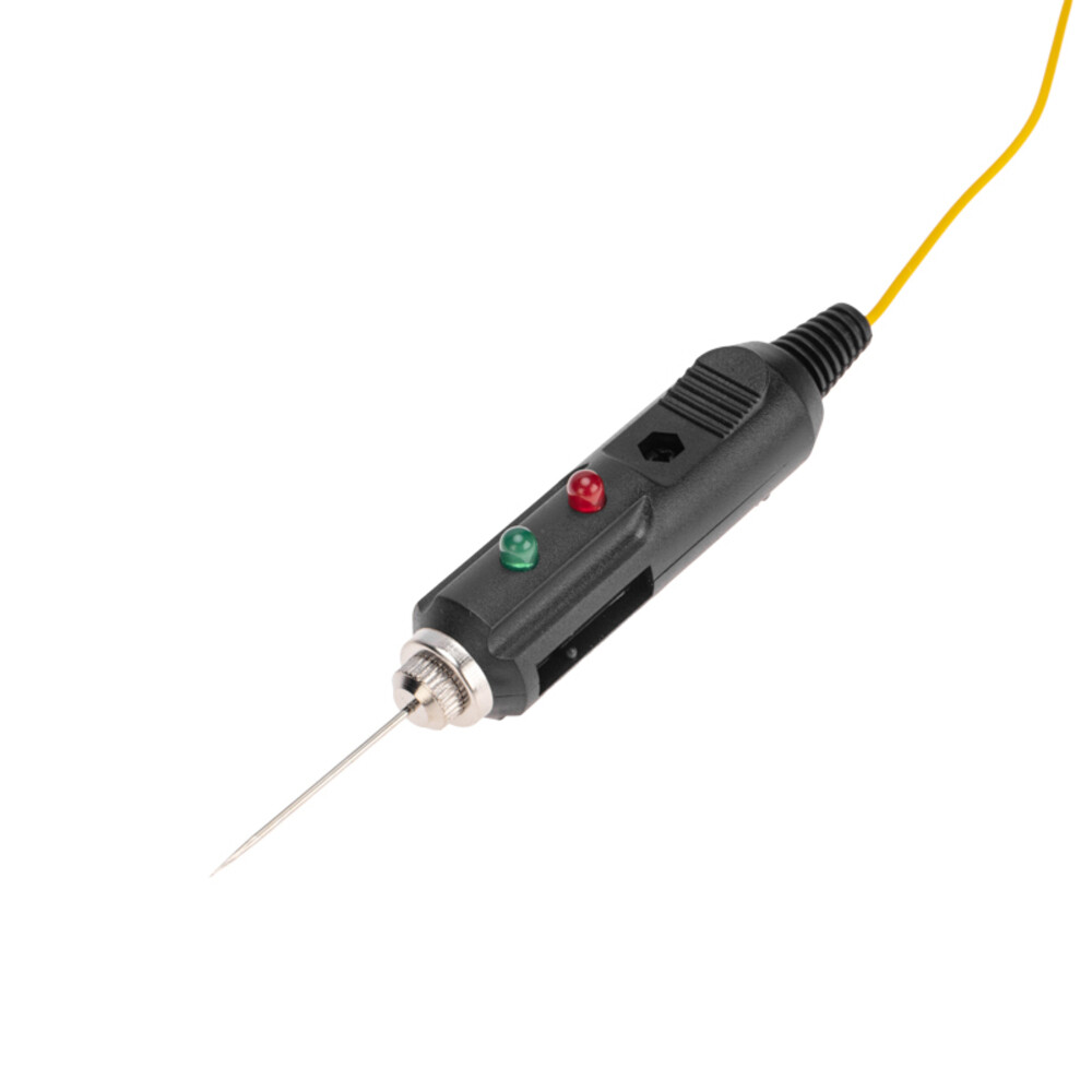 Позволяет определить полярность напряжения (+/-), выявить замыкание и обрыв проводки без необходимости размыкать проводку – за счет возможности ввести тонкую иглу непосредственно через изоляцию в проводку или проверить предохранители, лампочки и диоды. Корпус выполнен из ударопрочного пластика и снабжен проводом с зажимом типа «крокодил», светодиодным и звуковым индикатором.