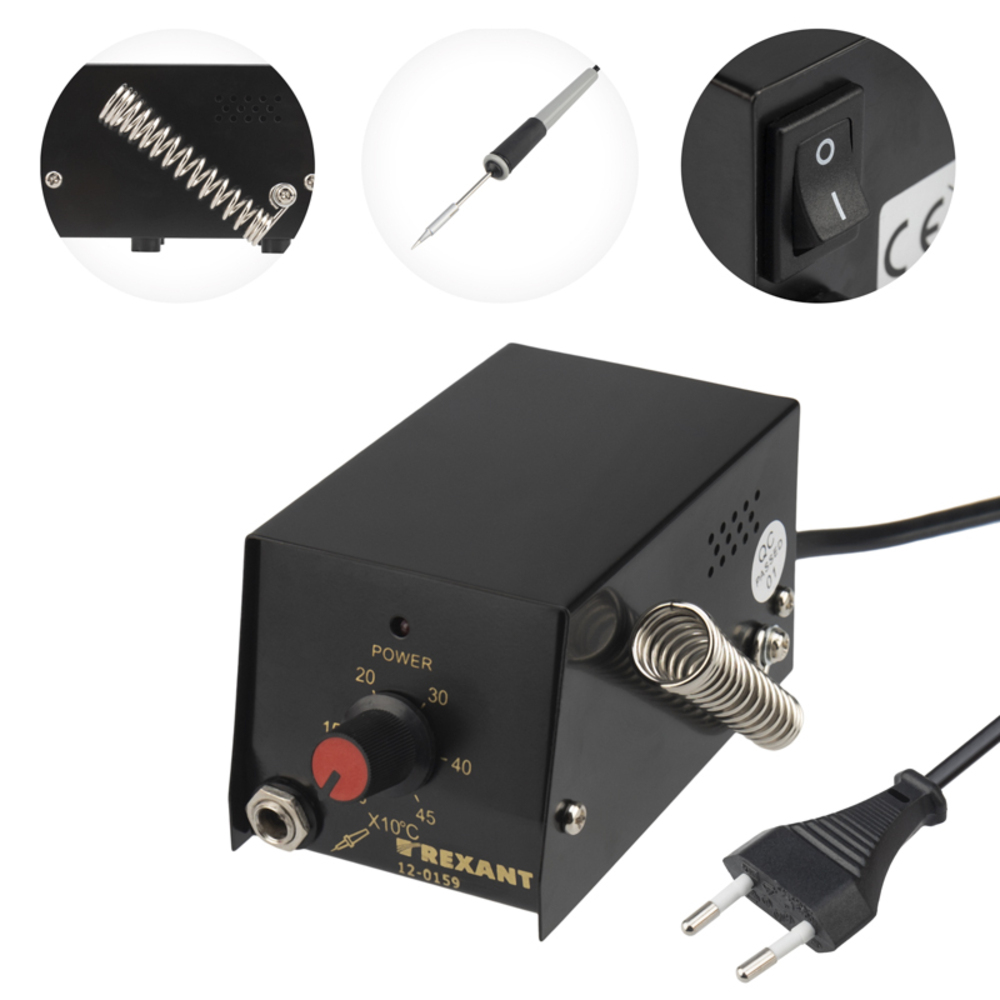 Температура нагрева жала варьируется в диапазоне от 100 до 450°С и регулируется с помощью механического потенциометра. Станция комплектуется миниатюрным низковольтным (12 В) паяльником.