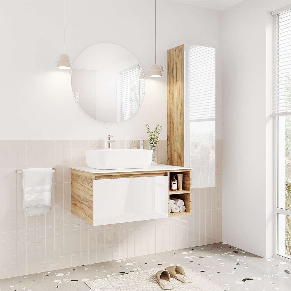 • Фасад пенала выполнен из безопасного закалённого стекла молочного цвета, корпус – влагостойкий ЛДСП цвета дуб крафт золотой.