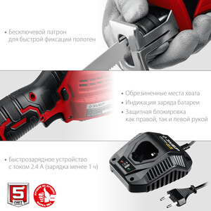 Пила сабельная – 1 шт., Аккумулятор – 1 шт., Зарядное устройство – 1 шт., Руководство по эксплуатации – 1 шт.