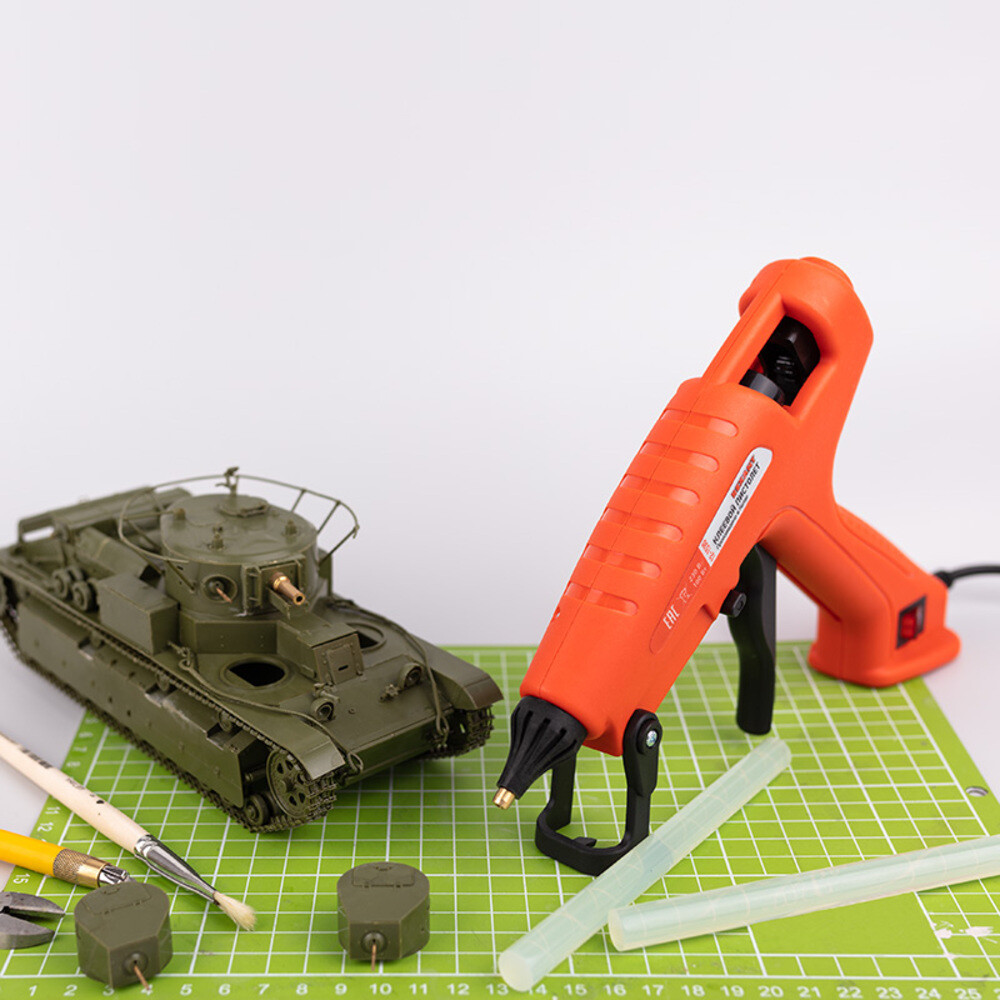 Корпус клеевого пистолета изготовлен из ударопрочной пластмассы и имеет скобу для установки в режиме ожидания.