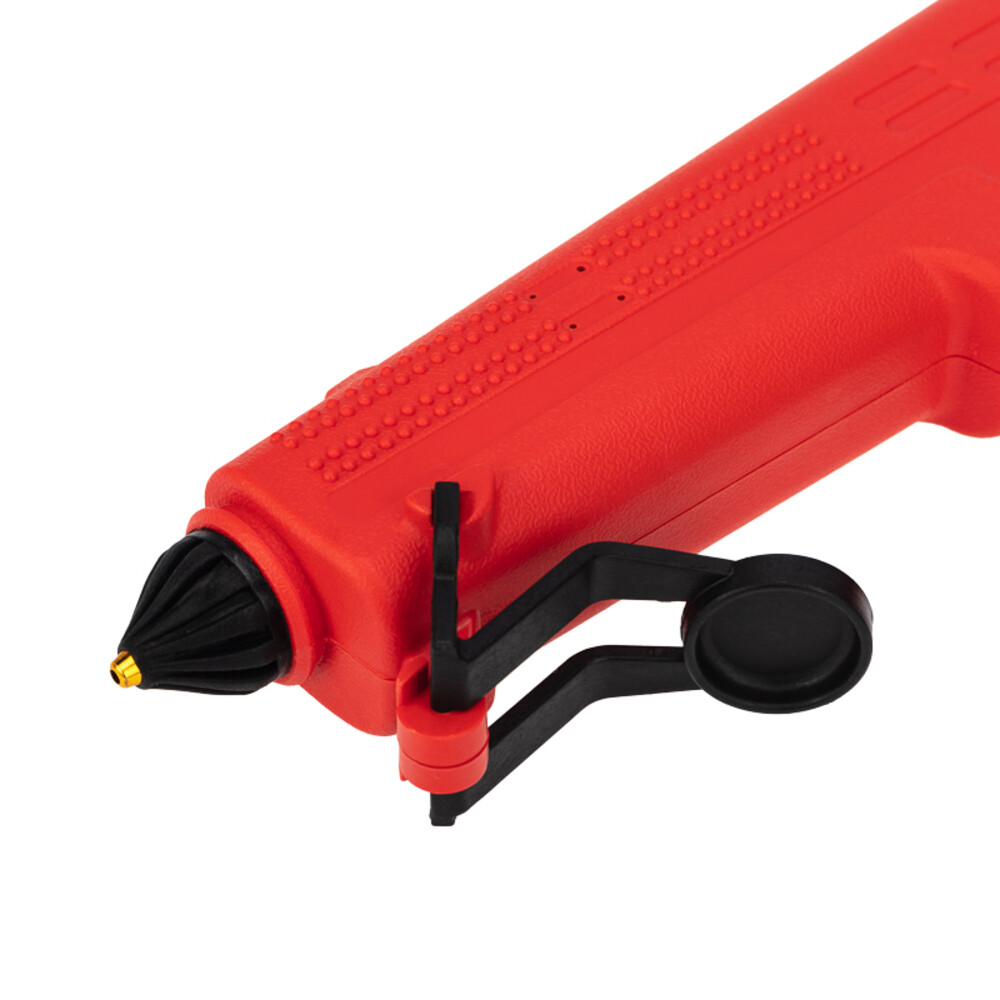 Корпус клеевого пистолета изготовлен из ударопрочной пластмассы и имеет скобу для установки в режиме ожидания.