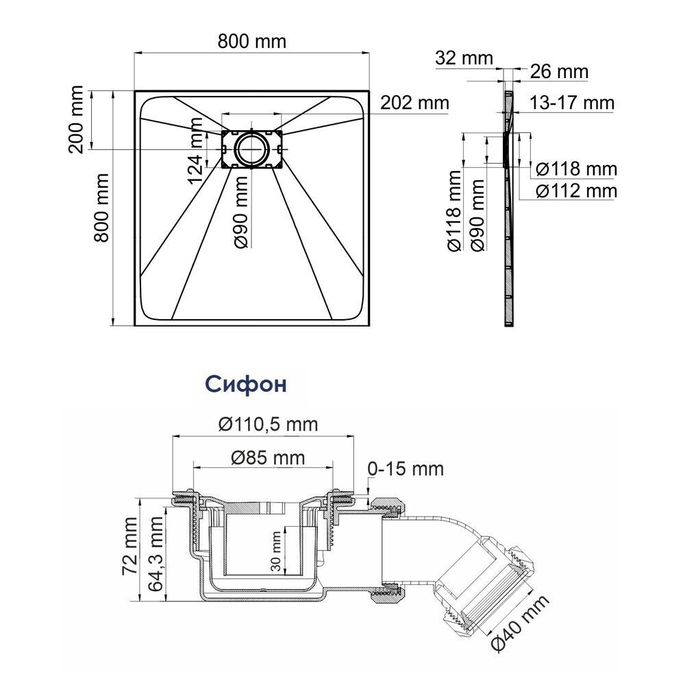 Душевой поддон – 1 шт., сифон – 1 шт., заглушка SMC (стеклопластик) – 1 шт.