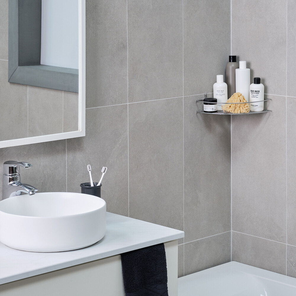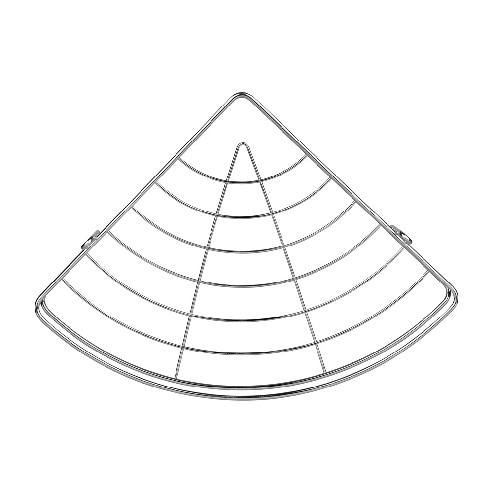 Одноярусная угловая настенная полка из стали с гальваническим покрытием цвета хром.