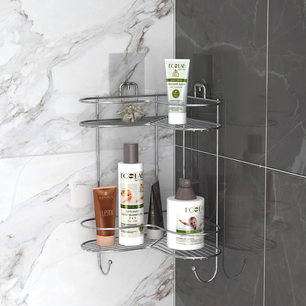 Полка для ванной Kleber Lite угловая двухъярусная с крючками 240х240х425 мм металл/силикон хром (KLE-LT083)