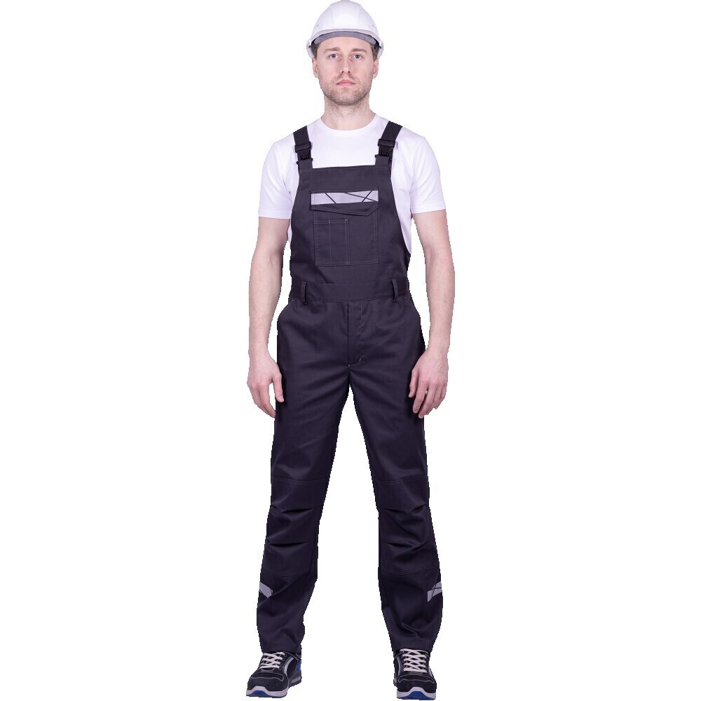 Полукомбинезон прямого силуэта, с настрочным поясом, с притачным нагрудником и спинкой, с правосторонней застежкой на 3 обметанные петли и пуговицы, с пятью шлевками. Нижняя боковая часть полукомбинезона со световозвращающей термоклеевой полосой.