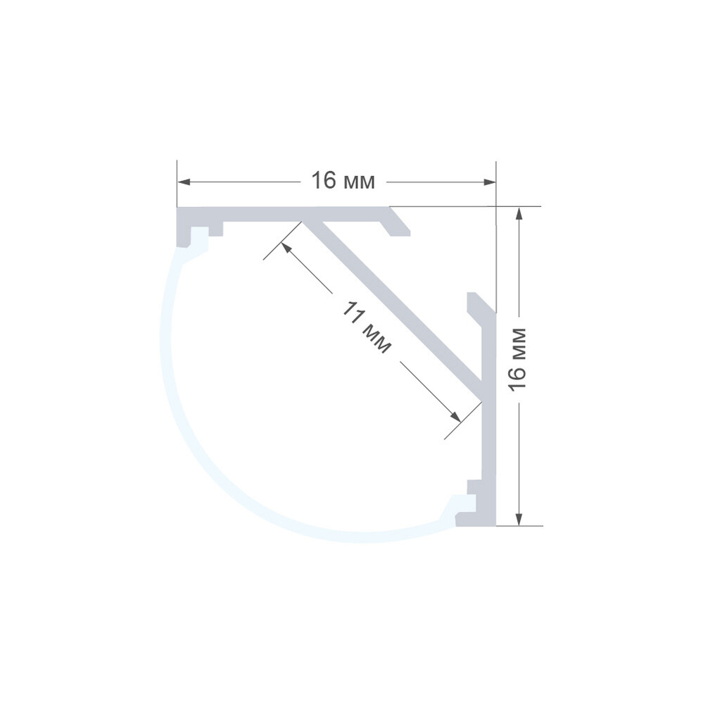 Предназначен для скрытого и открытого монтажа светодиодной ленты на любые поверхности. Алюминиевый профиль для светодиодной ленты по своей конструкции является накладным угловым, а это значит, что такой вариант профиля подходит для монтажа накладным способом в угол между двумя плоскими поверхностями, а его свечение направлено под углом 45°. Данная модель алюминиевого профиля имеет размер 16х16х1000 мм и внутри него можно разместить светодиодную ленту шириной до 10 мм. В алюминиевый профиль уже установлен рассеиватель белого цвета, изготовленный из светорассеивающего поликарбоната. Благодаря дробеструйной обработке, профиль имеет матовую поверхность, а анодирование сохранит серебристый цвет, защищая профиль от окисления.