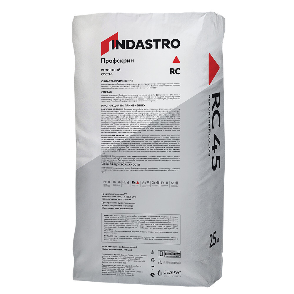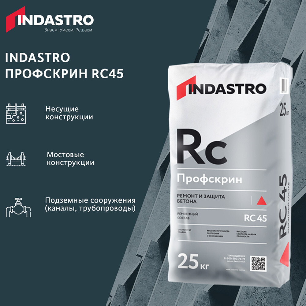 Высокопрочный безусадочный ремонтный состав Профскрин RC 45 тиксотропного типа, содержащий полимерную фибру, предназначенный для конструкционного ремонта бетона марки М400 и выше.