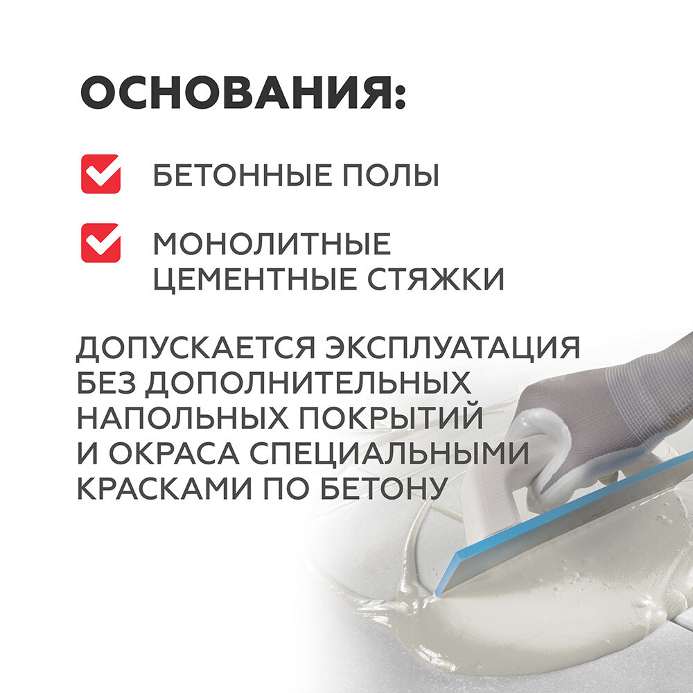 Подходит под укладку керамической плитки, линолеума, ковролина, паркета, ламината, последующих финишных выравнивающих слоёв и использования в системе «теплый пол». Допускается эксплуатация выровненной поверхности без дополнительных напольных покрытий, а также окраска специальными красками по бетону.