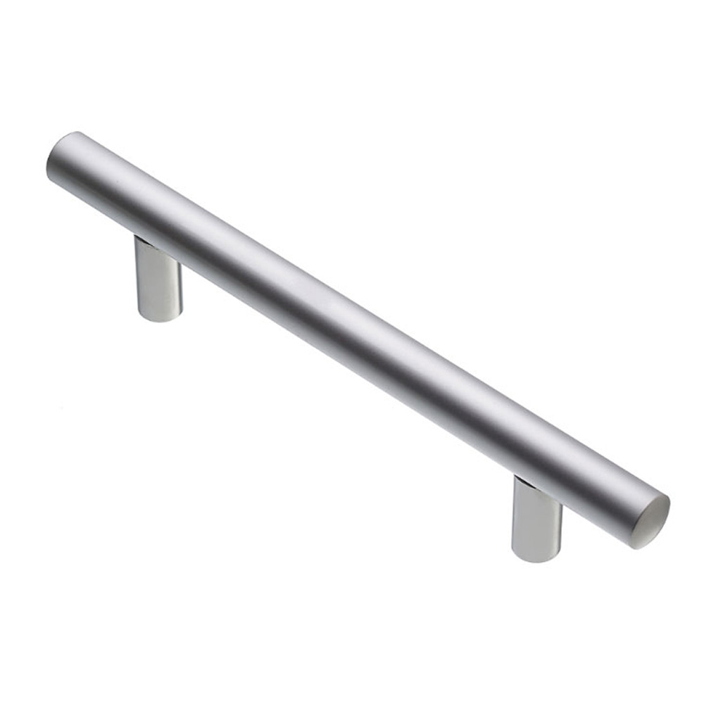 Используется преимущественно в кухонных гарнитурах. Это металлическая ручка в виде прямой трубки с двумя дистанционными держателями (опорами). При выборе рейлинговой ручки важно обратить внимание на два ее основных параметра — габаритный размер (полная длина от края до края) и межосевой (расстояние между центрами креплений).