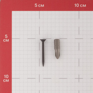 Шуруп с головкой потайной формы, с крестообразным шлицем и острым концом. В комплект входит бита РН2.