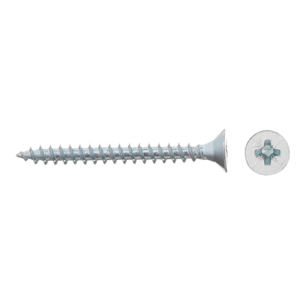 Саморезы имеют потайную головку с крестообразным шлицем PZ 2 и острый наконечник. Производятся из оцинкованной стали.