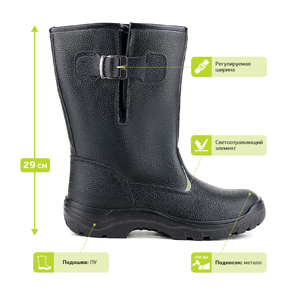Сапоги Prosafe серии basic предназначены для защиты ног от общих производственных загрязнений в отапливаемых помещениях и на открытом водухе в летний период. Модель дополнена ремнем с металлической пряжкой для возможности регулировать и комфортно фиксировать ширину голенища. Текстильная подкладка Камбрель обеспечивает воздухопроницаемость и гигроскопичность. В модели предусмотрена текстильная съемная стелька. Светоотражающие элементы повышают видимость работников в темное время суток, а также на неосвещенной территории. Однослойная маслобензостойкая полиуретановая подошва литьевого метода крепления имеет вставку в пяточной части подошвы, обладающую амортизационными свойствами и способную гасить ударные нагрузки при ходьбе. Глубина протектора ходового слоя обеспечивает хорошую сцепляемость с поверхностями и препятствует скольжению за счет…