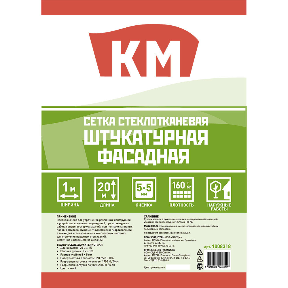 Сетка фасадная стеклотканевая ячейка 5х5 мм 1х20 м 160 г/кв.м КМ