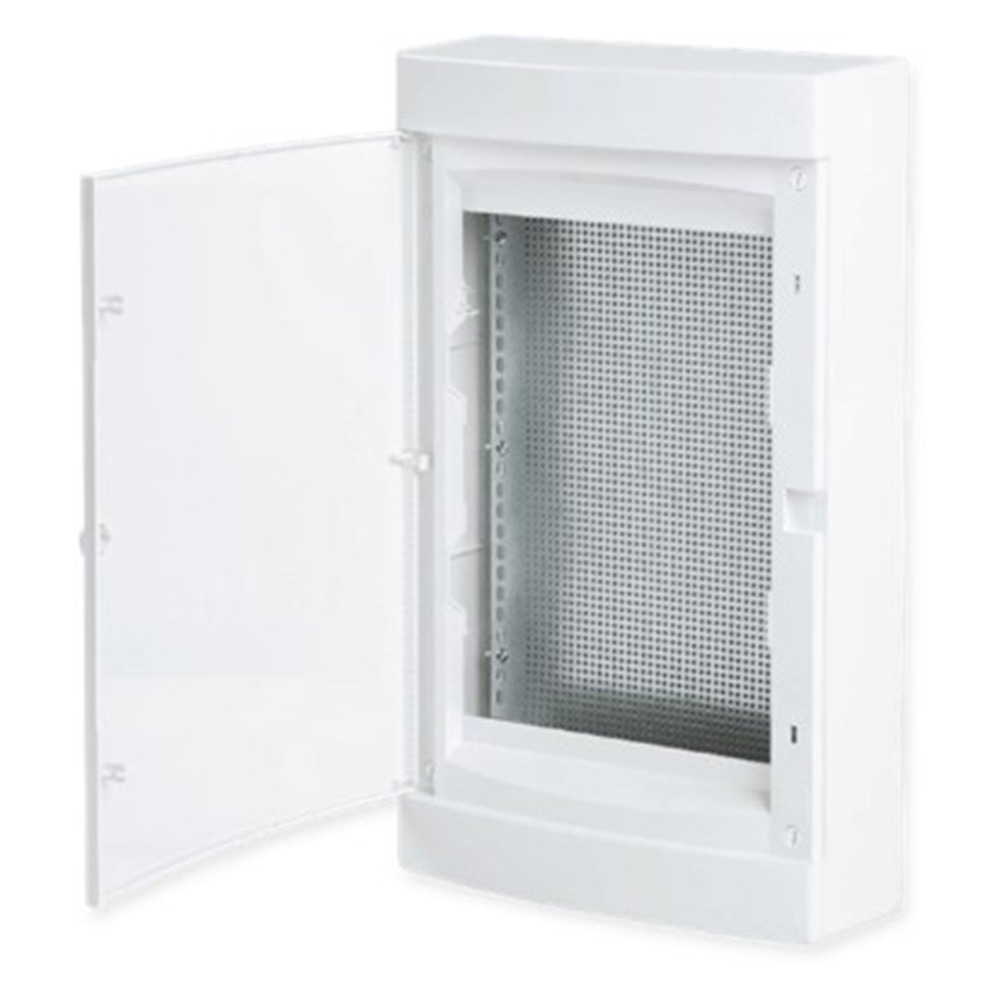 Предназначен для сборки силовых распределительных и слаботочных щитов. На DIN-рейки устанавливается модульное оборудование. На монтажные платы — антенные разветвители, Wi-Fi роутеры, патч-панели и иное слаботочное оборудование. Щиты устанавливаются на поверхность стены. Ассортимент корпусов с din-рейками представлен размерами вместимостью до 72 модулей, по 12 или 18 модулей в ряду, с белой глухой или прозрачной тонированной дверью, с DIN-рейками или перфорированными монтажными платами. Особенностью корпусов является плоское основание, упрощающее сборку и подключения внутри, лицевая панель изготовлена из качественного глянцевого ABS-пластика, имеет минималистичный дизайн и впишется в большинство интерьеров.