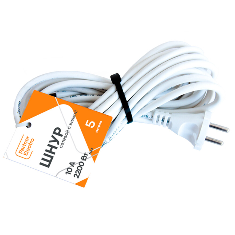 Шнур сетевой с вилкой 5 м ПВС-ВП 2х0,75 кв.мм 10 А Партнер-Электро белый (ЦБ-00013567/4521)
