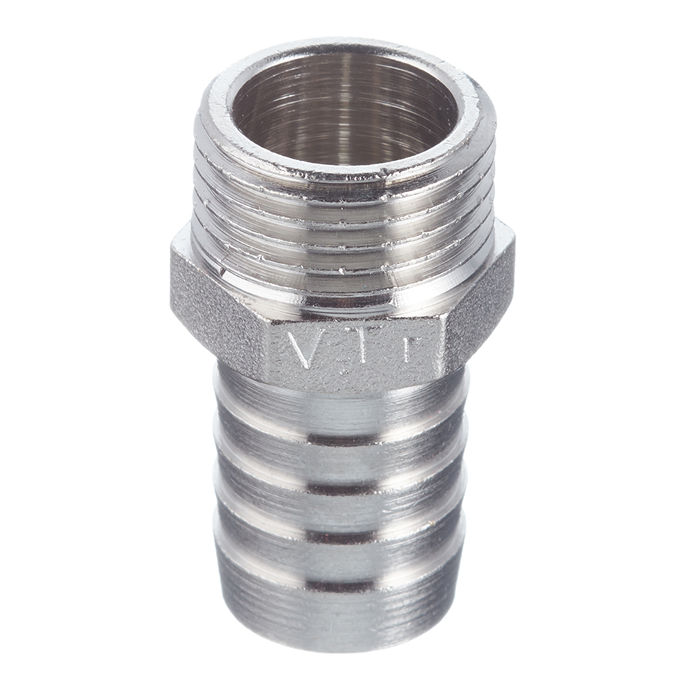 Предназначен для подключения к водозапорной арматуре, непосредственно к трубопроводам поливочного шланга. Изделие можно применять также в других системах с неагрессивной к используемым материалам рабочей средой (горячая вода, незамерзающий теплоноситель, сжатый воздух и т.д.). Фитинг выполнен из сантехнической латуни CW617N, защищенной никелевым гальванопокрытием. Присоединительный патрубок снабжен цилиндрической трубной наружной резьбой с насечками для лучшего удержания герметика. Штуцер для шланга имеет конфигурацию, эффективную для его фиксации. Присоединение шлангов необходимо производить с помощью плоских обжимных хомутов.