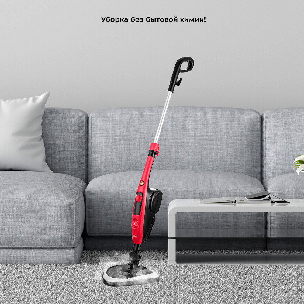 Паровая швабра КТ-1017 поможет избавиться от пыли и грязи с помощью мощной струи пара, а также продезинфицирует обрабатываемую поверхность. Устройство оснащено резервуаром для воды емкостью 550 мл, что позволяет производить непрерывную уборку до 55 мин. Принцип действия паровой швабры основан на воздействии горячего пара на загрязнения. Пар проникает внутрь загрязнения, размягчая и растворяя его, а затем с помощью тряпки частички грязи смываются. Высокая температура пара способствует процессу очистки. Конструкция «2 в 1» предусматривает наличие ручного модуля, который удобно использовать с насадками. С помощью насадок можно почистить шторы и мягкую мебель. Струйная и угловая насадка помогут очистить щели, углы и другие труднодоступные места. Для очистки окон, зеркал и кафельной плитки предусмотрена специальная насадка для отпаривания со скребком. Ее можно использовать с тряпкой для отпаривания, чтобы отпаривать одежду и чистить обивку мягкой мебели. Плавная регулировка уровня подачи пара позволяет настраивать интенсивность работы устройства. Это очень удобно при очистке разных типов поверхностей с разным уровнем загрязнения. Чем сильнее загрязнение, тем больше пара потребуется. Для паровой швабры не нужны чистящие средства, поэтому она станет идеальным решением для уборки дома для аллергиков. В комплекте предусмотрена рамка для ковра, которая обеспечивает легкое скольжение щетки для пола по ковру. Паровая швабра может стоять вертикально без дополнительной поддержки. С помощью держателя на рукоятке, шнур не будет мешаться. Множество насадок, которые идут в комплекте с паровой шваброй, справятся с труднодоступными местами и сложными поверхностями.
