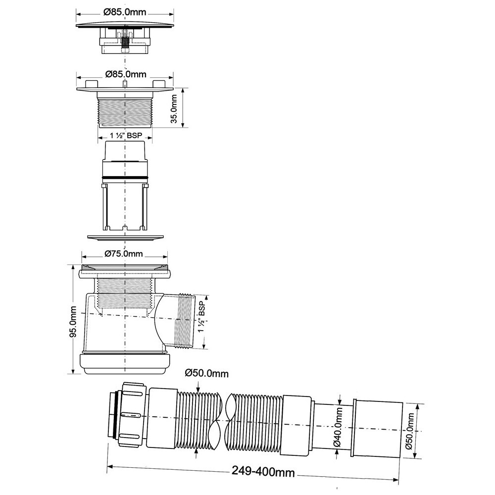 Сифон для душевого поддона McAlpine 1 1/2х40/50 мм регулируемый слив d40-55 мм с выпуском d85 мм с соединением 40/50 мм (MRS3C-SF)
