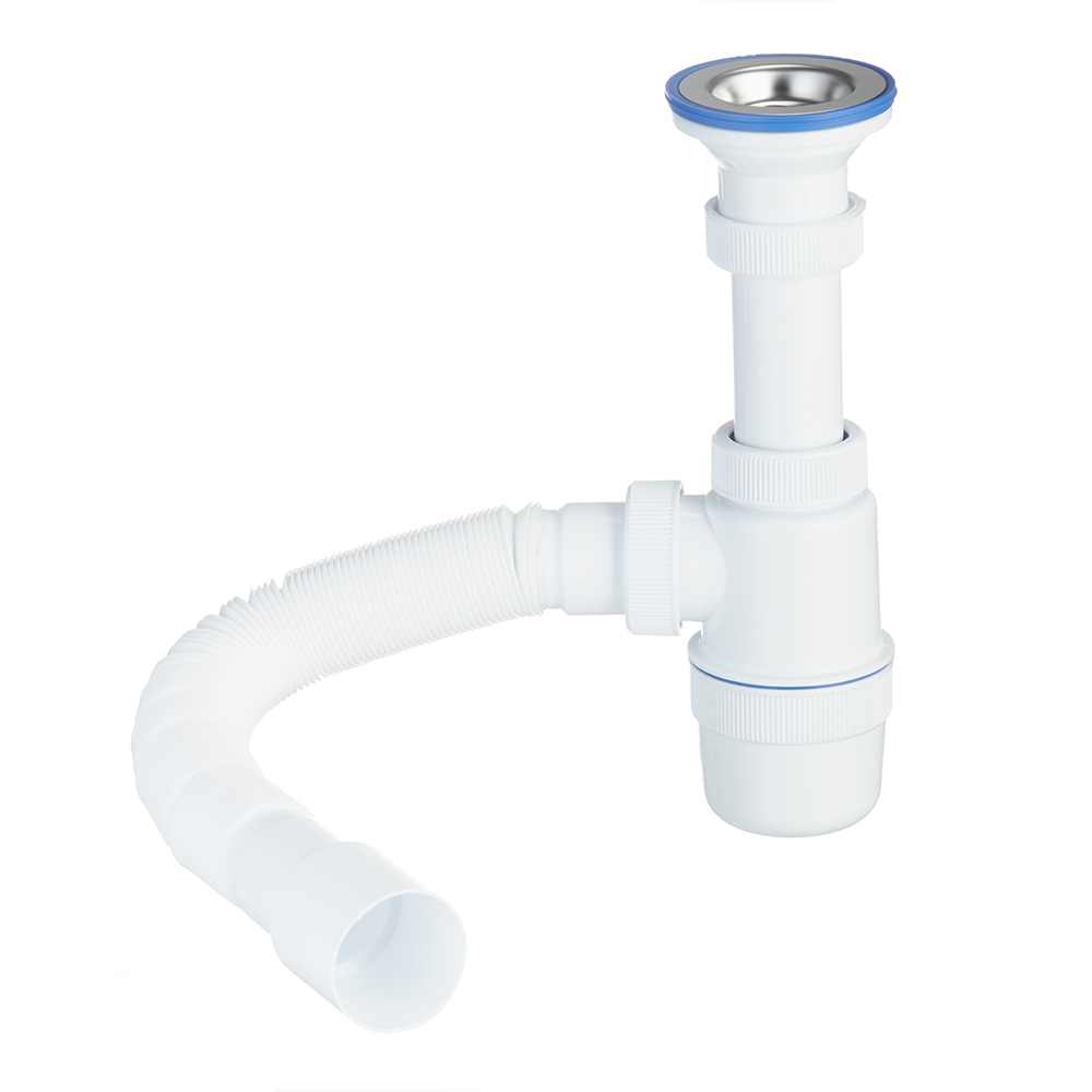Состав (материалы): сифон, гибкое соединение – полипропилен; чашка – нержавеющая сталь; прокладки – ПВХ, ПНД.