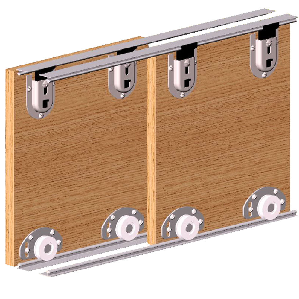 Алюминиевая направляющая подрезается под необходимую ширину проема шкафа. Ролики крепятся с тыльной стороны фасада и не заметны при использовании. Комплект рассчитан на установку двух раздвижных фасадов.