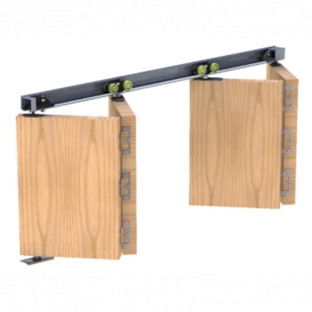 Данную систему можно использовать для монтажа двойной складной двери с шириной секции до 900 мм и весом каждой до 25 кг. Отсутствие нижней направляющей не портит эстетичный вид двери и всего помещения в целом.