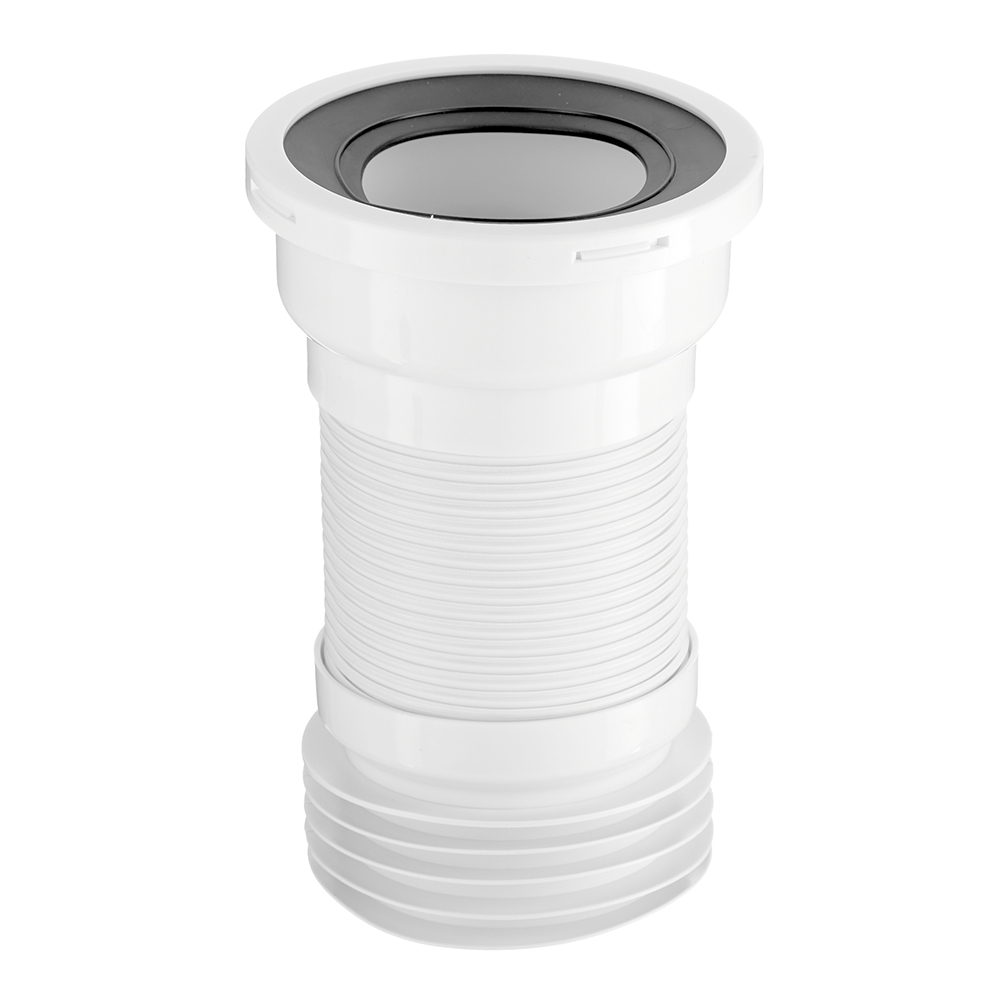 Для чугунных труб канализации. Длина трубы 185-350 мм, присоединение к унитазу через резиновую муфту, выход на канализацию 100-110 мм. Удлинители гибкие выполняют функцию фановых труб и предназначены для соединения унитаза с канализационной трубой. Основное преимущество в том, что они легко монтируются и нет необходимости заранее замерять угол и расстояние (как в случае с фановыми трубами). Гофрированная часть трубы армирована металлической проволокой, что значительно повышает прочность и износостойкость изделия.