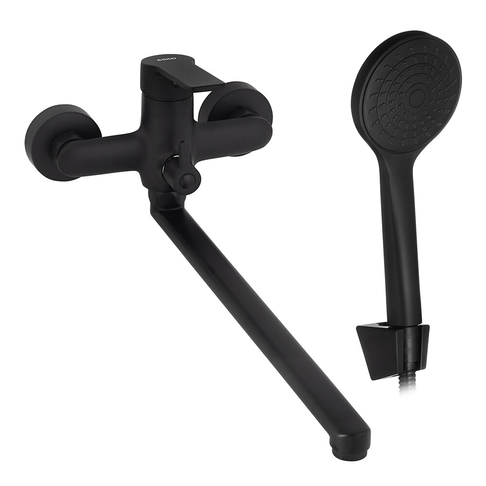 Смеситель для ванны черный однорычажный с длинным изливом и лейкой. Предназначен для ванны и душа.