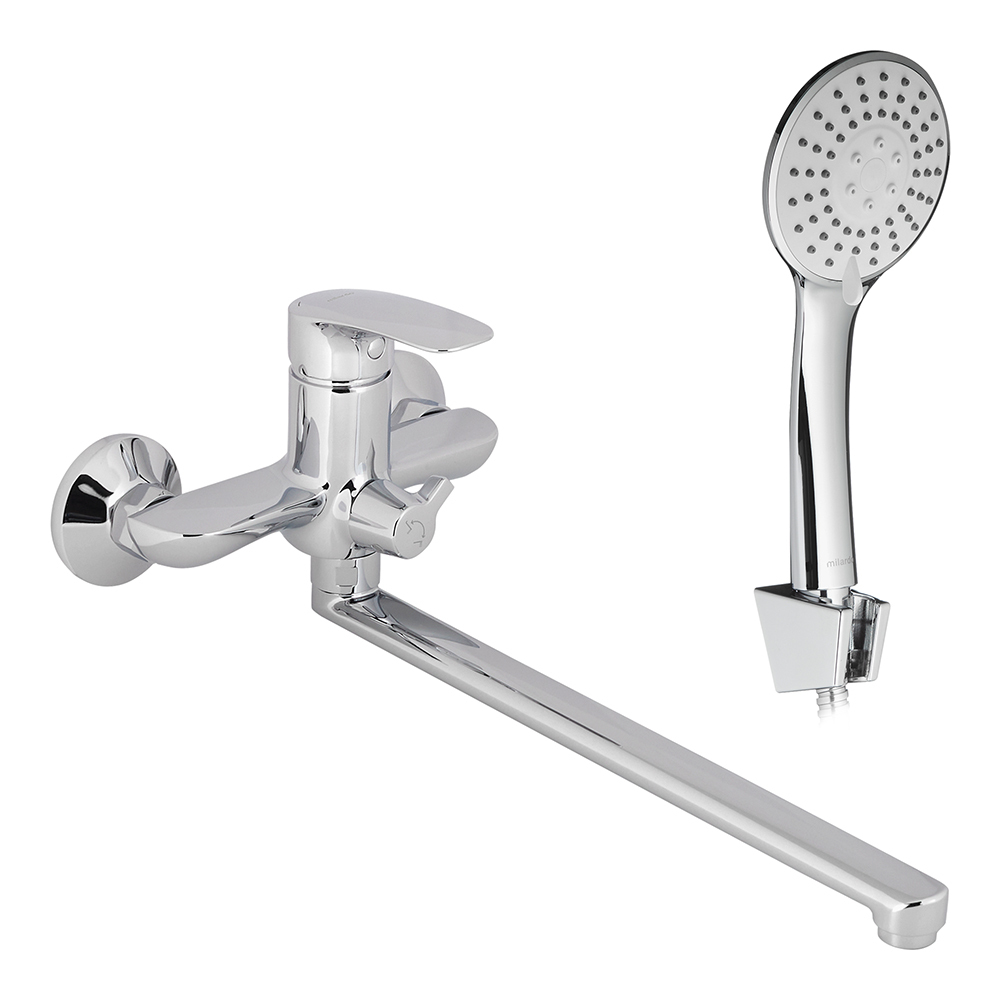 Смеситель для ванны Rora. Наличие длинного (35 см) излива позволяет использовать пространство ванны максимально эффективно. Интенсивность и температура потока легко регулируются удобной ручкой смесителя. Поворотный дивертор работает при любом давлении воды, переключая поток воды на большую душевую лейку (ø 100 мм) или в комбинированном режиме. Ручная лейка из прочного ABS-пластика, ПВХ-шланг (1,5 м) в оплетке из нержавеющей стали и крепеж идут в комплекте. Качественный механизм смешивания воды смесителя Milardo® рассчитан на более чем 70 000 циклов работы – это не менее 15 лет эксплуатации семьей из трех человек.