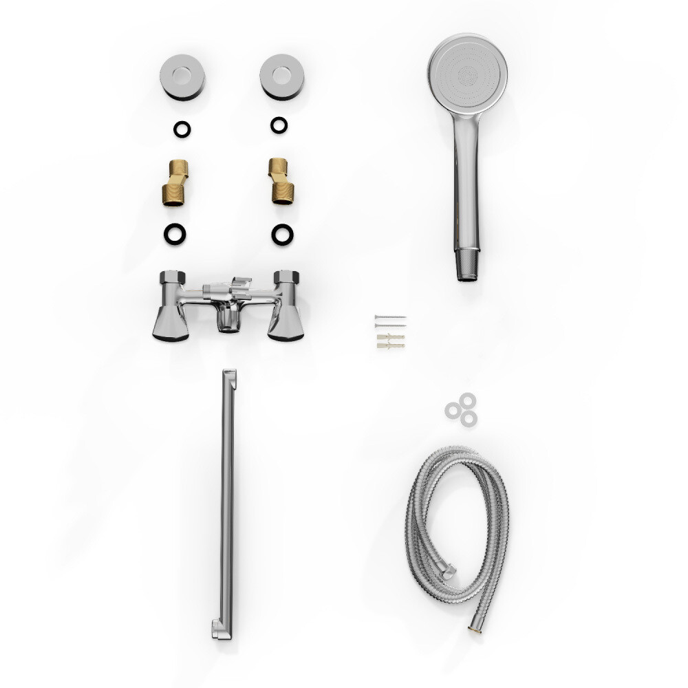Комплектация: смеситель, латунные эксцентрики, отражатели, шланг хромированный из нержавеющей стали (1,5 м), душевая лейка 1 режим, держатель для лейки с креплением.