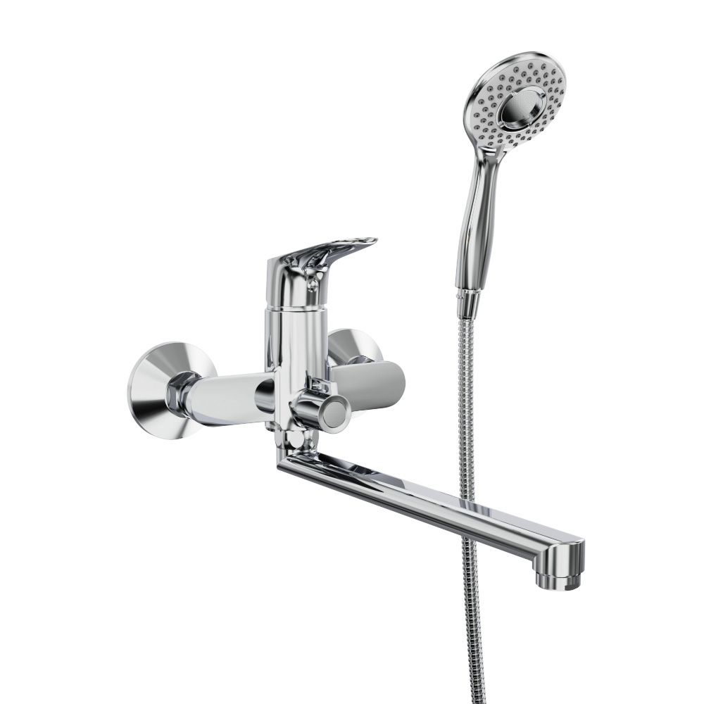 Комплектация: смеситель, латунные эксцентрики, шланг хромированный из нержавеющей стали (1,5 м), душевая лейка 3 режима, держатель лейки.
