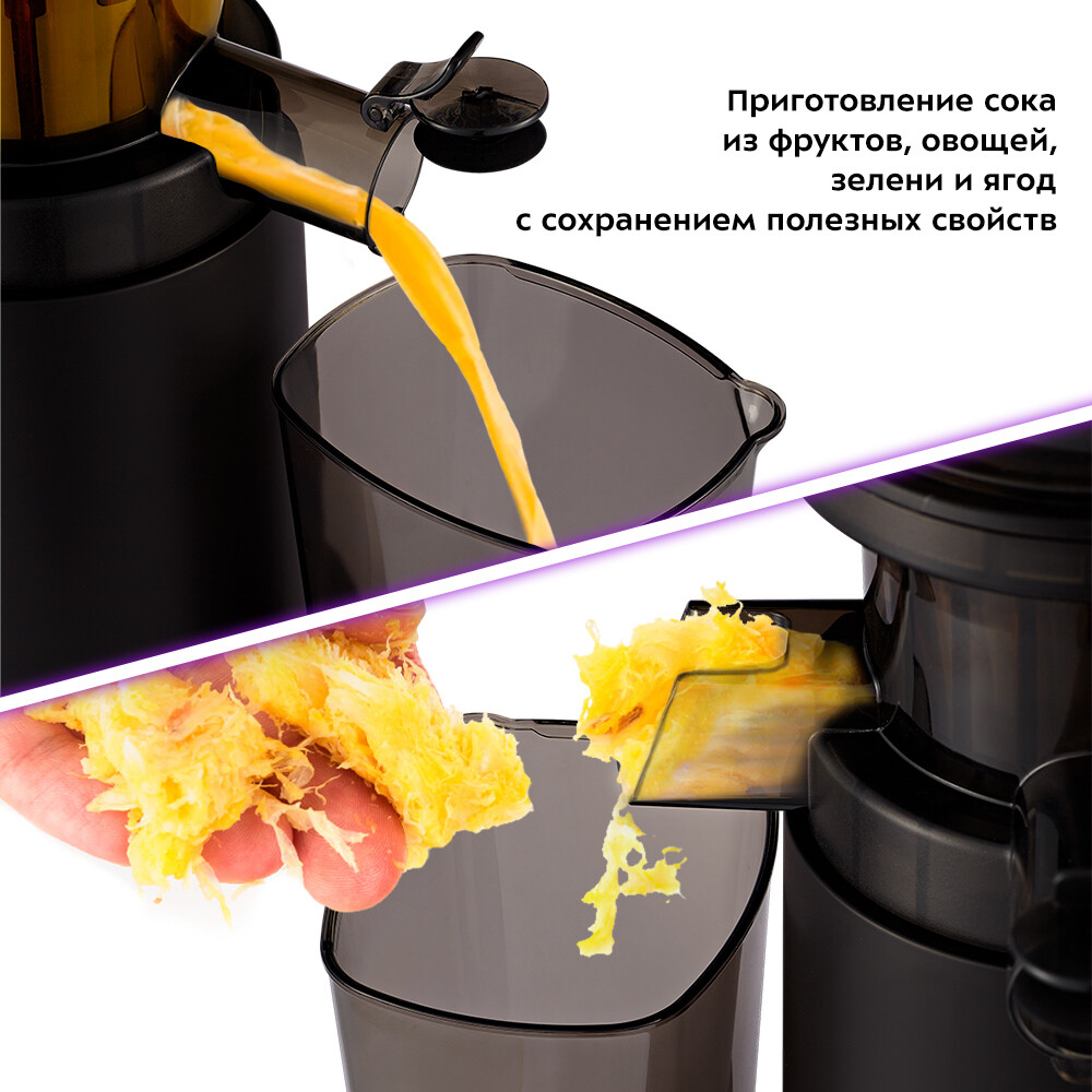 Шнековая соковыжималка Kitfort КТ-1128 отжимает максимально возможное количество сока из фруктов, овощей и зелени, сохраняя все полезные вещества: витамины, аминокислоты и минералы.