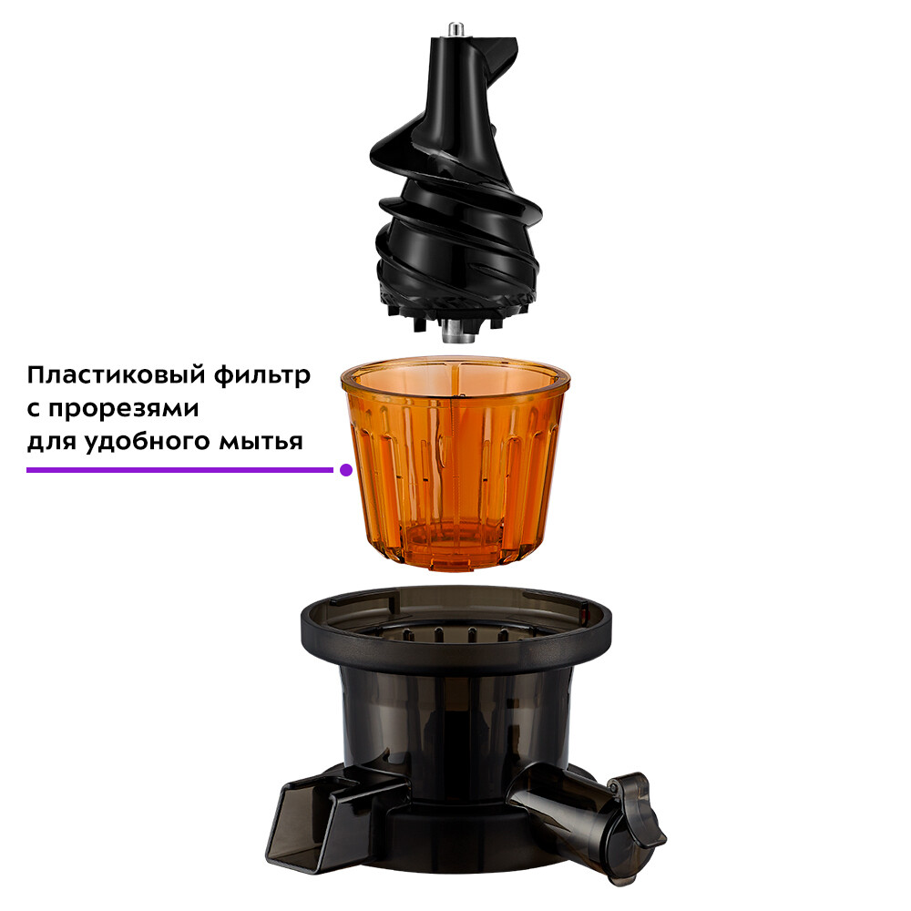 Шнековая соковыжималка Kitfort КТ-1128 отжимает максимально возможное количество сока из фруктов, овощей и зелени, сохраняя все полезные вещества: витамины, аминокислоты и минералы. Использует технологию низкоскоростного отжима, потребляя всего 150 Вт. Спиралевидный шнек-пресс дробит и прессует продукт, а затем продавливает мякоть, которая поступает к нему через загрузочный лоток через фильтр, отделяя жмых от сока. Шнек отлит из ультрапрочного пластика, который хорошо выдерживает большие нагрузки. Низкая скорость вращения на 58 об/мин обеспечивает значительно более низкую температуру в процессе отжима, что способствует сохранению питательной ценности продуктов. В соковыжималке сок почти не вспенивается и получается с небольшим количеством пены. Он сделан не из нержавеющей стали в виде сетки, а из пластмассы с прорезями. Такой фильтр легк…