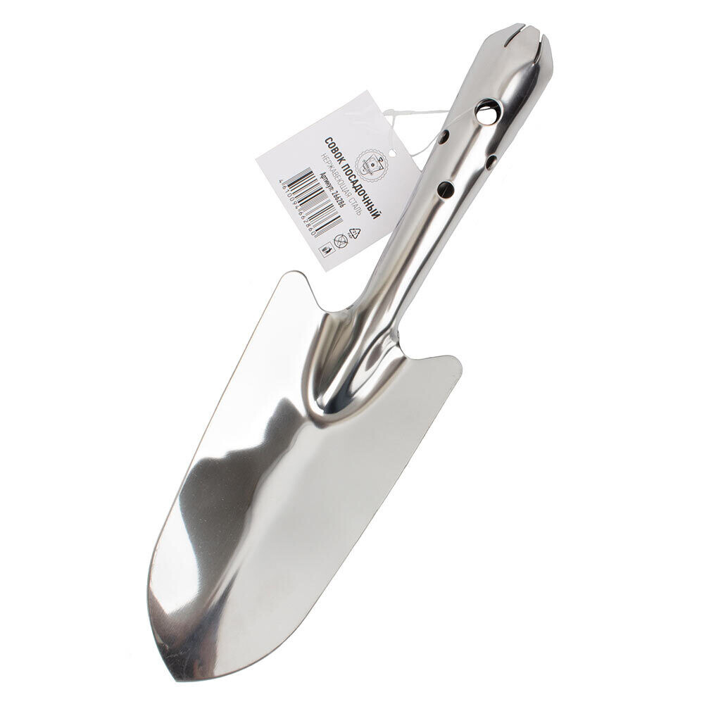 Совок посадочный. Изготовлен из нержавеющей стали, не боится влаги, не гнется и не ржавеет. Эргономичная конструкция позволяет комфортно проводить посадку, культивацию, прополку и посев.