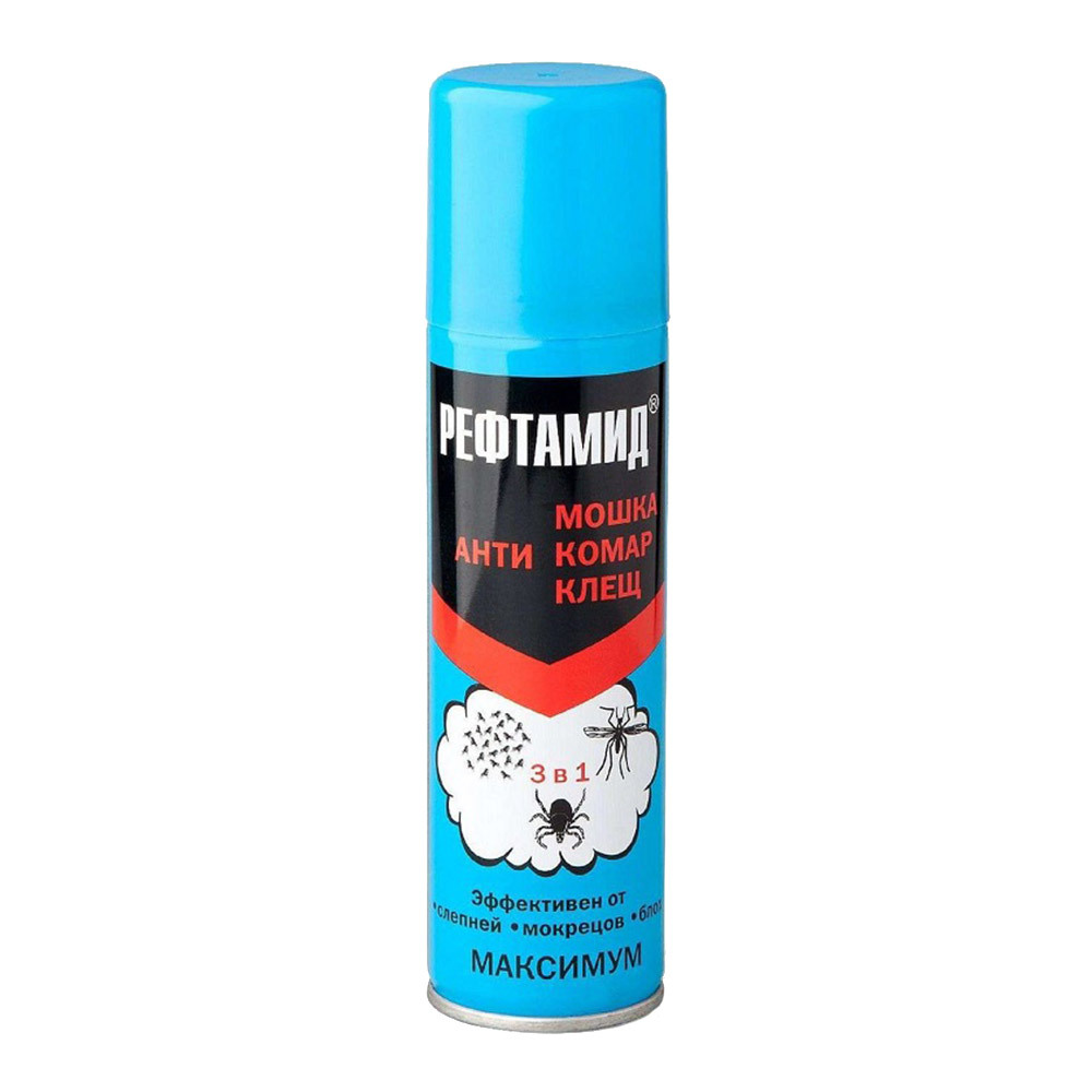 Рефтамид Максимум — универсальный препарат для защиты людей от нападения комаров, мошки, лесных и таёжных клещей. Содержит высокоэффективный действующий компонент, сохраняет своё действие в течение 4-5 часов. Средство наносится как на одежду, так и открытые участки кожи. В состав помимо активного компонента ДЭТА — 28%, включена усиливающая защитные свойства препарата ванильная отдушка.
