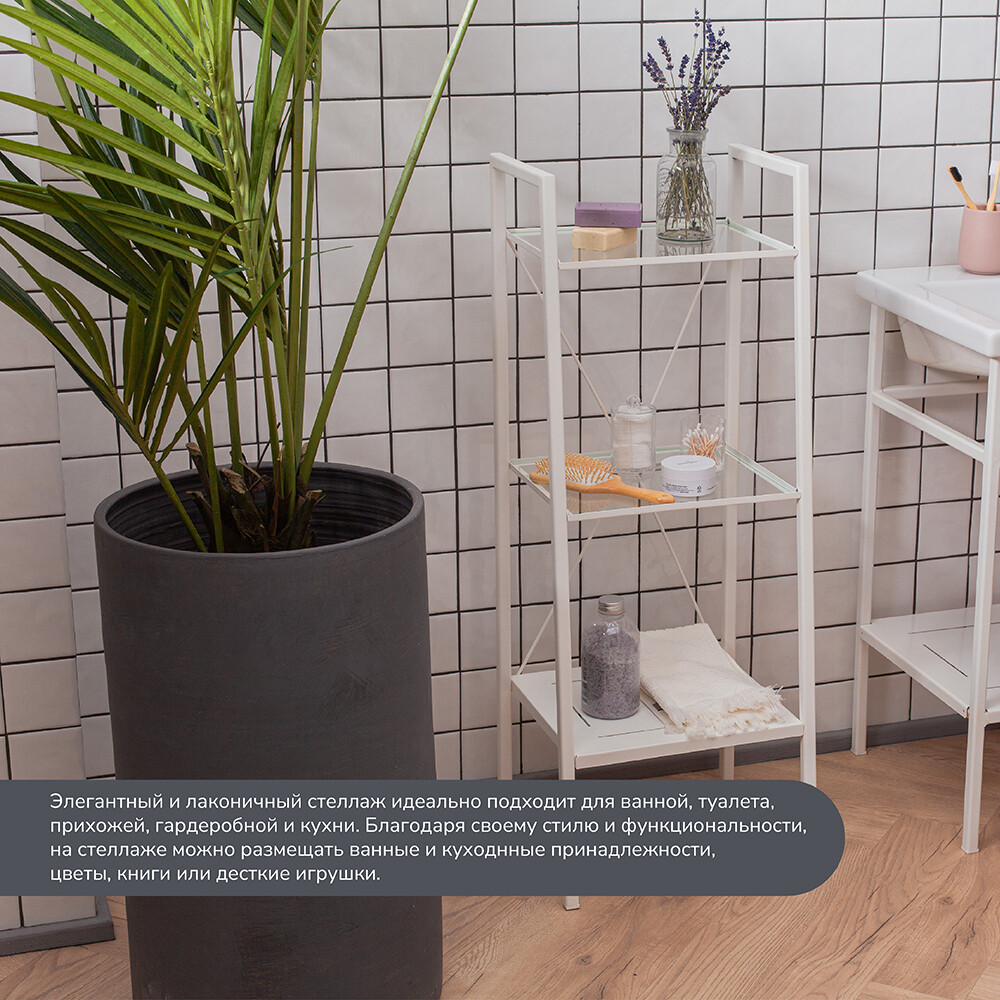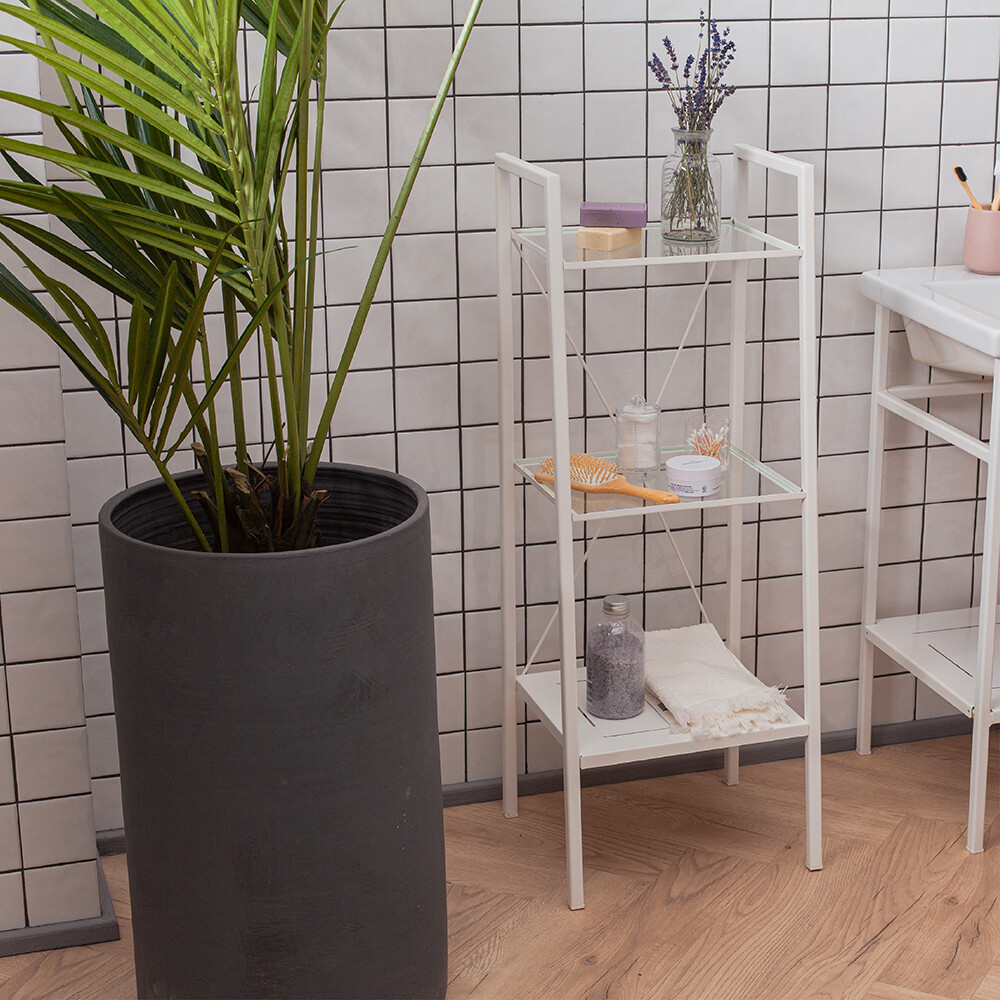 Стильный и практичный стеллаж с полками из закаленного стекла можно использовать как для хранения полотенец, косметических и гигиенических средств, так и для размещения элементов декора. Не привлекает к себе излишнее внимание, выглядит легким, поэтому визуально не загромождает пространство.