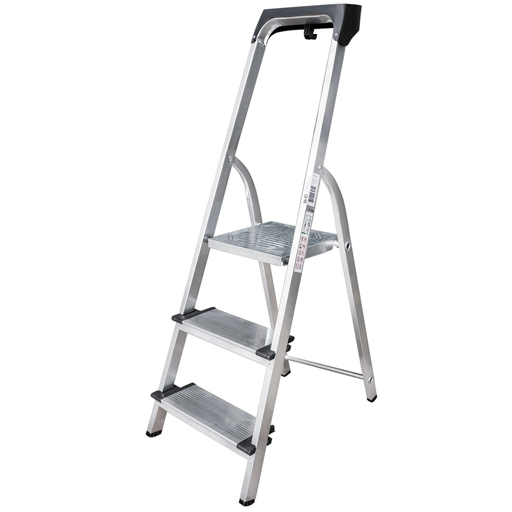 В основании стремянки прочная рама из алюминиевого профиля прямоугольного сечения. Пластиковые наконечники препятствуют скольжению, и обеспечивают отличную устойчивость. Многократное клепаное соединение ступеней с рамой обеспечивает исключительную надежность и безопасность при работе на стремянке. Имеет пять ступеней шириной 130 мм, что позволяет стопе комфортно размещаться на лестнице.