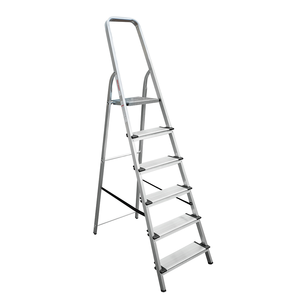 В основании стремянки прочная рама из алюминиевого профиля прямоугольного сечения. Пластиковые наконечники препятствуют скольжению, и обеспечивают отличную устойчивость. Многократное клепаное соединение ступеней с рамой обеспечивает исключительную надежность и безопасность при работе на стремянке. Имеет шесть ступеней шириной 130 мм, что позволяет стопе комфортно размещаться на лестнице.