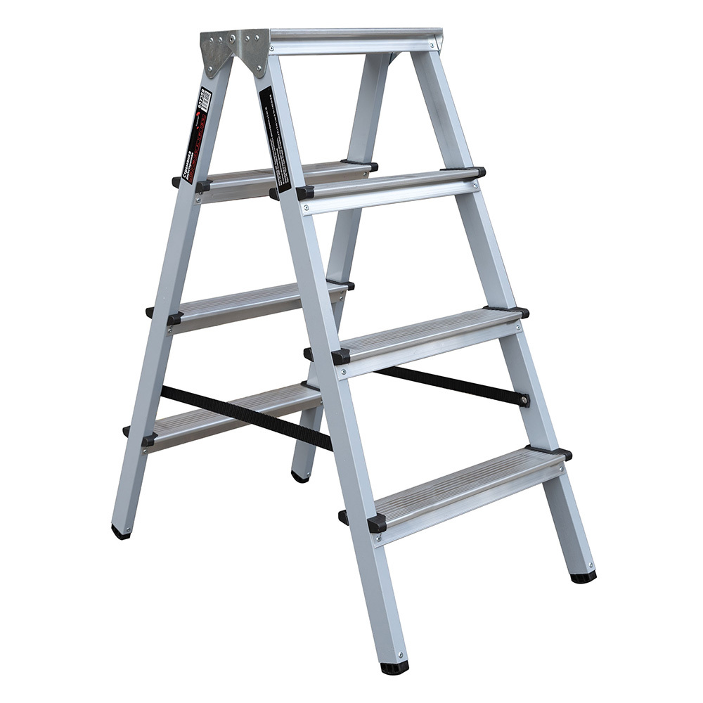 Стальная двухсторонняя стремянка Hesler 2×4 алюминиевые ступени предназначена для бытового использования. Стойки изготовлены из стального профиля с порошковой окраской, предохраняющей от коррозии, сохраняющей чистоту рук и рабочих поверхностей. Рифленые ступени 80 мм (евростандарт) для надежного сцепления. Заклепочное крепление ступеней обеспечивает высокую статическую и динамическую прочность, а закругленные безопасные края ступеней и площадки смягчают контакт с голенью, предотвращают травмы. Пластиковые повторяющие рельеф заглушки ступеней с длительным сроком службы скрывают острые кромки. Алюминиевая складная площадка 350х160 мм из 2 ступеней позволяет удобно размещать инвентарь. Высота площадки — 0,87 м, рабочая высота — 2,87 м. Страховочные погодоустойчивые ремни на заклепках с увеличенной шляпкой создают жесткую конструкцию, не гниют и не выгорают. Башмаки из прочного пластика не скользят и не повреждают поверхность. Стремянка компактно складывается для хранения и транспортировки, в сложенном состоянии занимает мало места.