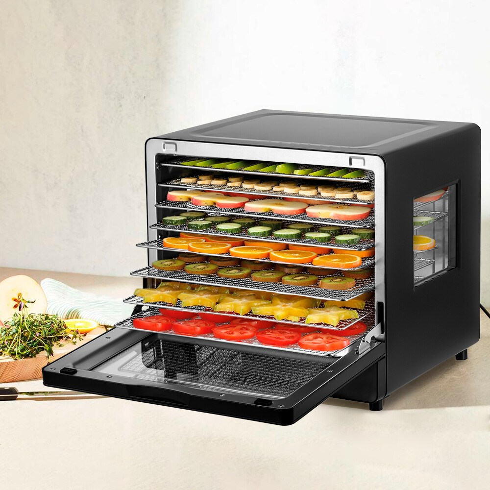 В сушилке установлен мощный нагревательный элемент и вентилятор с лопастями большого диаметра, обеспечивающий равномерное распределение нагретого воздуха по всему объему камеры. Благодаря горизонтальному обдуву смешение запахов при сушке одновременно разных продуктов минимально. На сушилке можно установить температуру сушки в диапазоне 35–70 оС с шагом 1 оС. Сушилка оснащена таймером до 48 часов работы с шагом 1 час, также можно установить время работы в минутах до 1 часа с шагом 1 минута.
