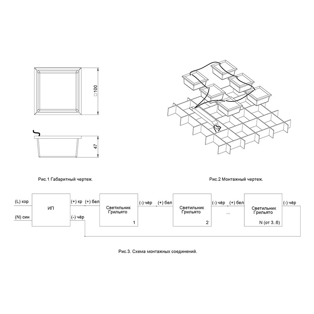 Светильник серии Бординг 1 предназначен для установки в потолок Грильято c ячейкой 100х100 при толщине профиля – 10 мм.